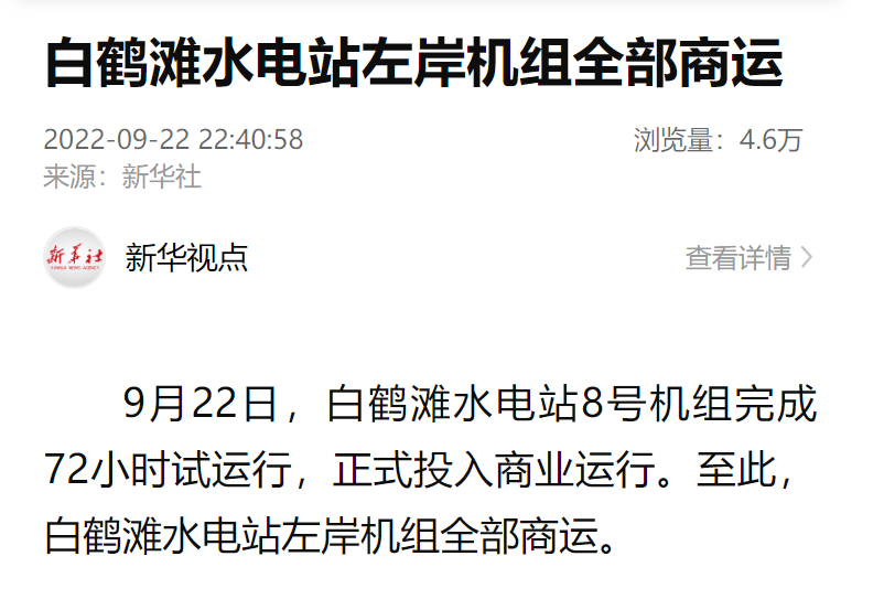 9月22日,白鹤滩水电站8号机组完成72小时试运行,正式投入商业运行。至此,白鹤滩水电站左岸机组全部商运。