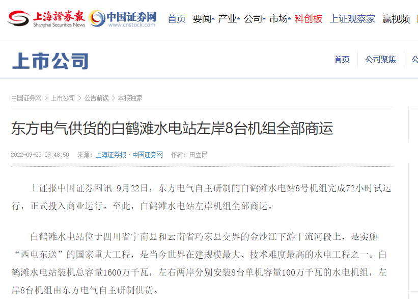 上证报中国证券网讯 9月22日,AG尊龙凯时电气自主研制的白鹤滩水电站8号机组完成72小时试运行,正式投入商业运行。至此,白鹤滩水电站左岸机组全部商运。
