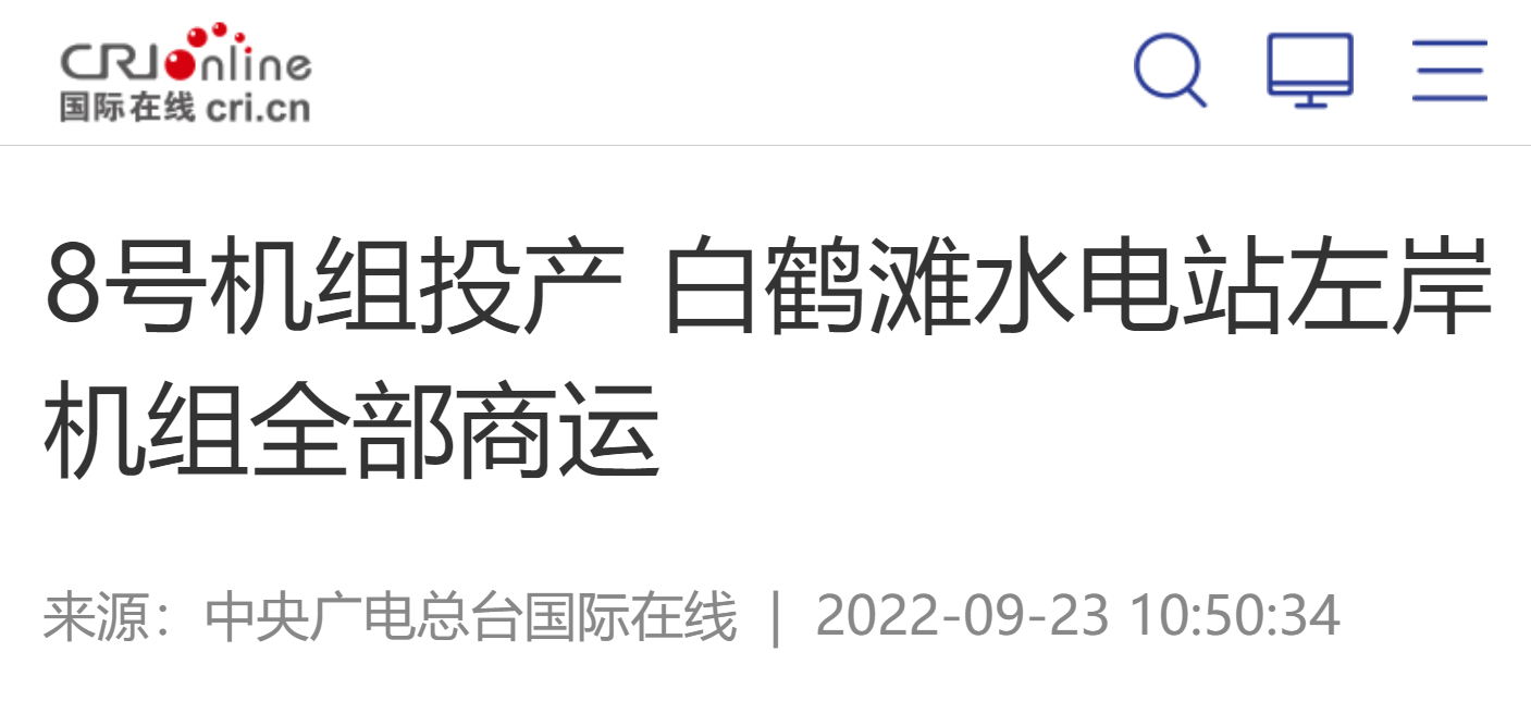 [中央广电总台国际在线]8号机组投产 白鹤滩水电站左岸机组全部商运
